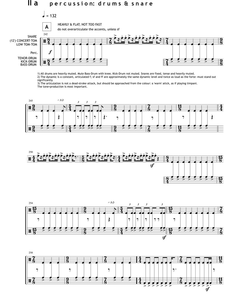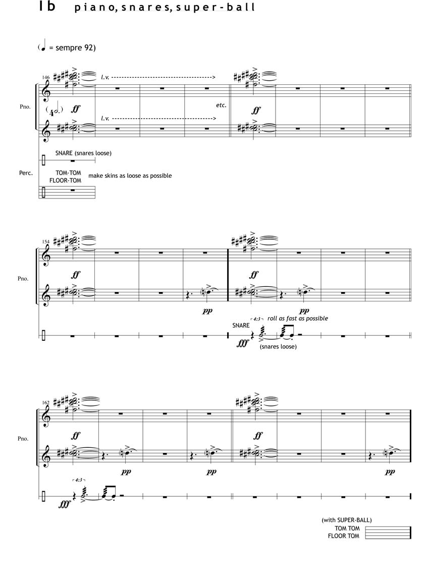 Battle Hymns consists of three movements, each exploring different ensemble-settings, metric relationships and sound worlds. The first of the three movements is split into two parts (‘ensemble 1’, for all three musicians, and ‘piano, snares and super-ball’, for piano and percussion). The second movement consists of two ‘solo pieces’, one for the percussionist (‘drums & snare’) and the other for the singer, singing over and into a large temple-bowl and accompanied by piano pizzicatos (‘singer, temple-bowls and piano-strings’). The final of the three movements (‘ensemble 2 - revolutionary song’) stars all three players again, each one now fully occupied.