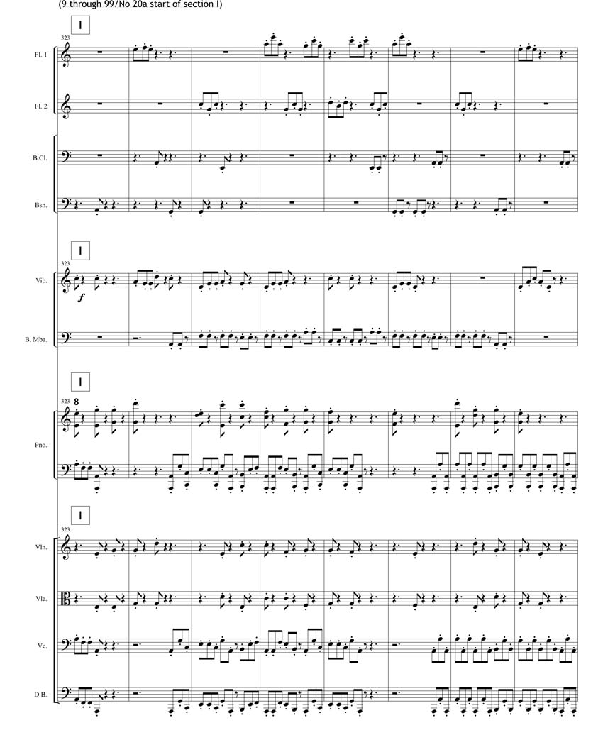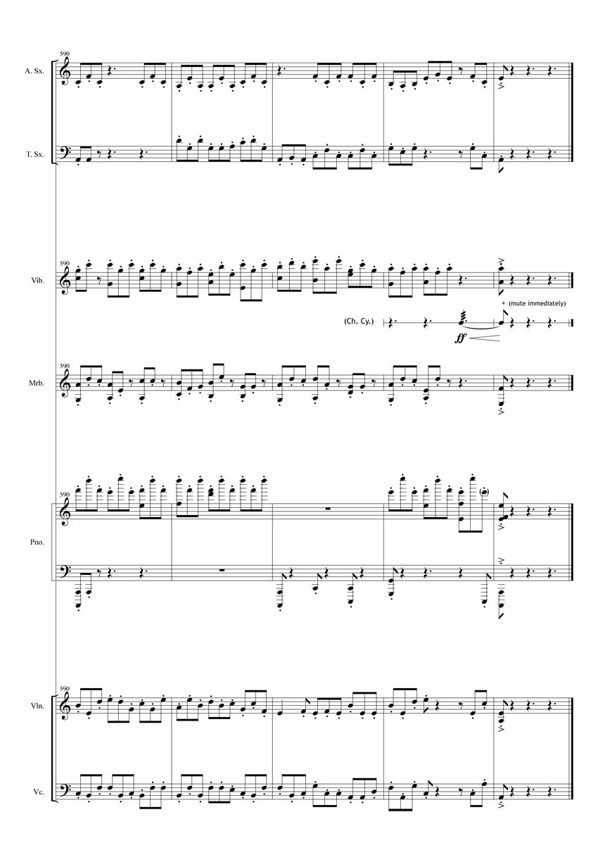 20c: alto sax, tenor sax, violin, cello, marimba, vibraphone, Chinese Cymbal & piano