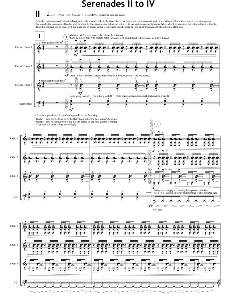 Serenades II to IV was written in the summer of 2004 for electric guitar quartet Catch and was premiered at the first edition of the Amsterdam Output Festival. The work was my first to exclusively employ amplified instruments and clearly betrays some of the joy I felt in playing around with the possibilities of the various effect boxes. The further I got into the piece, the more they also seemed to gain ground.