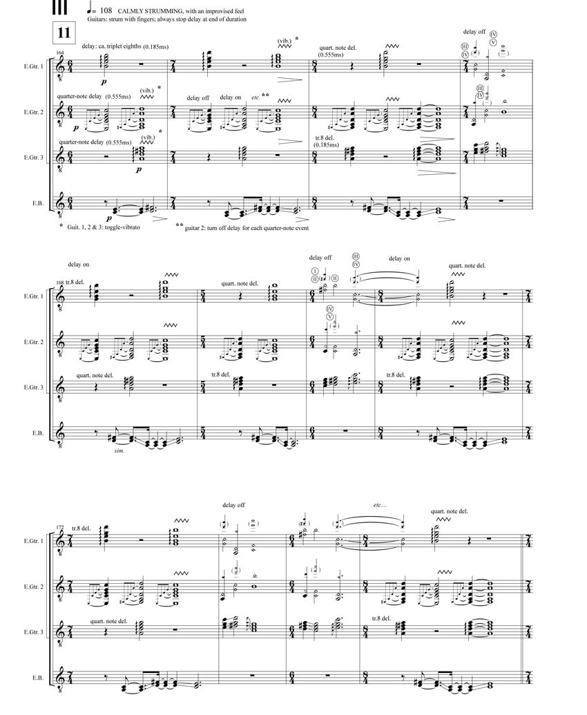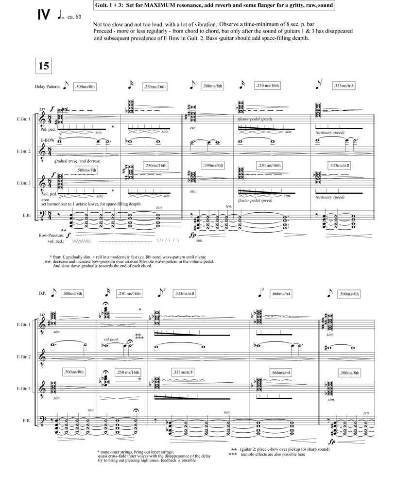 The piece therefore exhibits a somewhat strange sequence of events and ideas as it, firstly, omits any mention of a ‘First Part’ and then gradually seems to disintegrate more and more as the work progresses: from a fast, clear montage-form in the first part, erratically cross-cutting from register to register, via a slower – but still measured – movement, based entirely on the combination of slow strums, toggle vibrati, bell-harmonics and specified delays, to a final – much longer, quite dystopian – movement in which every sense of meter has disappeared and which revolves entirely around ‘live sound-sculpting’ - and some very complicated cross fading into the amps. It was especially this last section, built upon the idea of ‘crafting the sound before being allowed to proceed’ which opened up a whole new area in later pieces. The Serenades are thus, in every sense, a true ‘bridge-piece’.