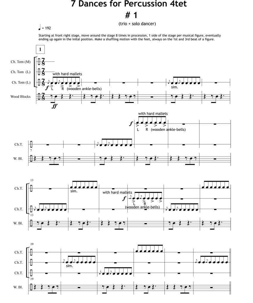 The 7 Dances for Percussion 4-tet (2005) were written for a dance production between Slagwerkgroep Den Haag and Dutch choreographer Marie-Cécile de Bont. Though the pieces are not intended to be danced to, they nevertheless are “dances”, but more in the sense of a Tanz ohne Schritte, like there are Lieder ohne Worte…