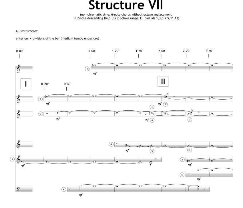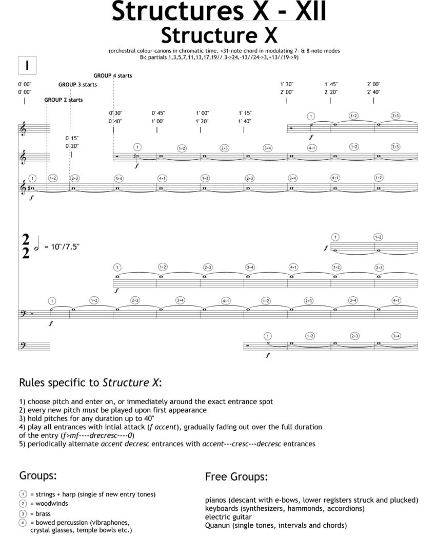 Structures I – XVI is an app. six-hour-long series of works, written in 2005, which deal with ideas of infinity and variable color-change. The series is subdivided into five size- and topic-related sets, which can be performed individually or within a sequence. The works can be played by any set-up ranging from small chamber ensembles to large orchestras, with or without live-delay. The music is notated according to the so-called technique of ‘available pitches’: a technique in which a gamut of pitches is notated within time-segments and the musicians are left free to choose both pitch as well as entry. The performers all play from the score, following a set of General performance instructions and a specified mapping-scheme customized to each particular occasion (for examples of playing instructions and Mapping (line-division) see popup menu above).