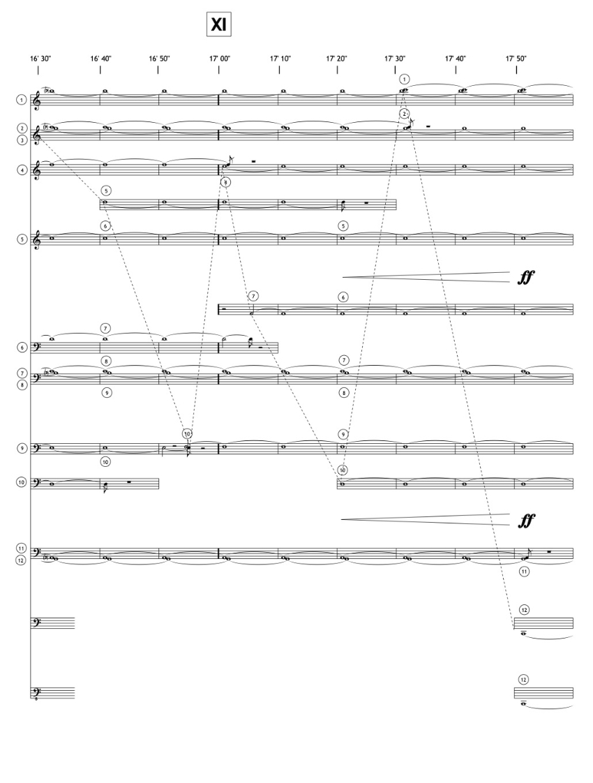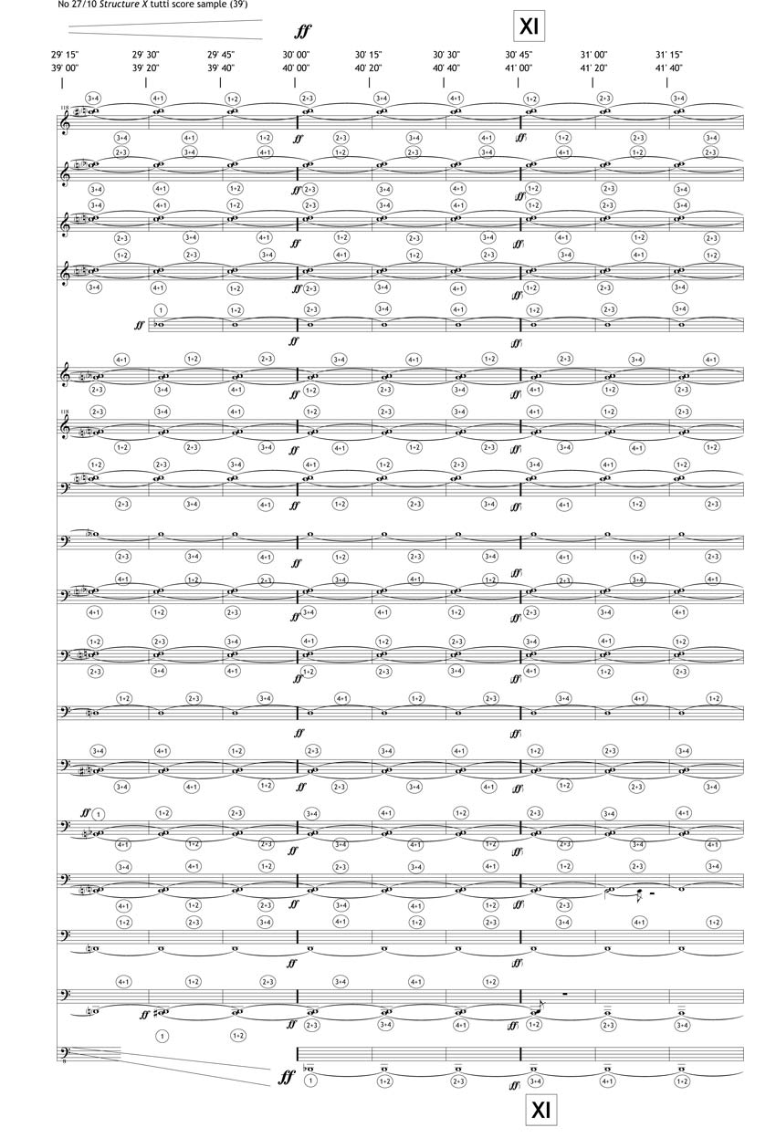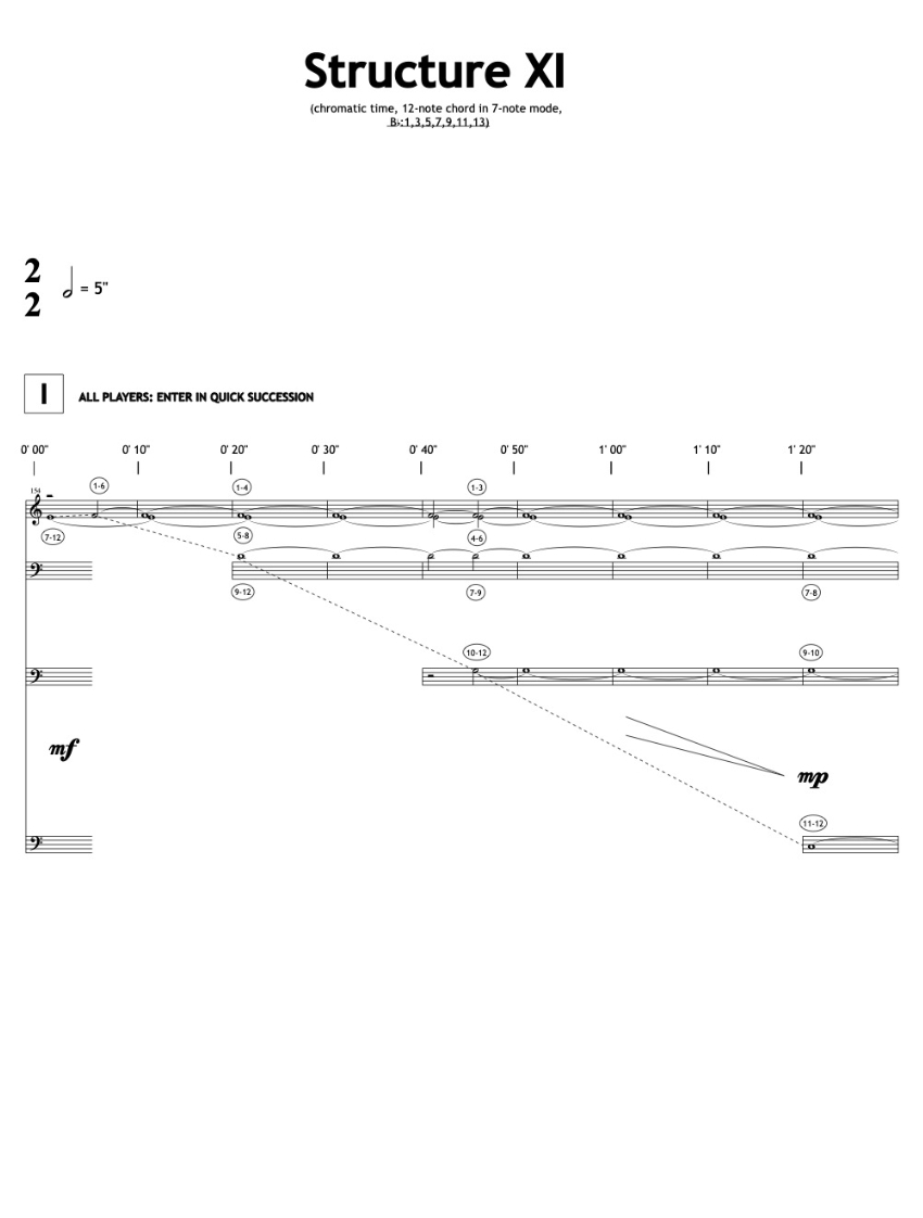 Structures X-XII are part of an app. six-hour-long series of works, written in 2005, which deal with ideas of infinity and variable color-change. The series is subdivided into five size- and topic-related sets, which can be performed individually or within a sequence. The works can be played by any set-up ranging from small chamber ensembles to large orchestras, with or without live-delay. The music is notated according to the so-called technique of ‘available pitches’: a technique in which a gamut of pitches is notated within time-segments and the musicians are left free to choose both pitch as well as entry. The performers all play from the score, following a set of General performance instructions and a specified mapping-scheme customized to each particular occasion (for examples of playing instructions and Mapping (line-division) see popup menu above).