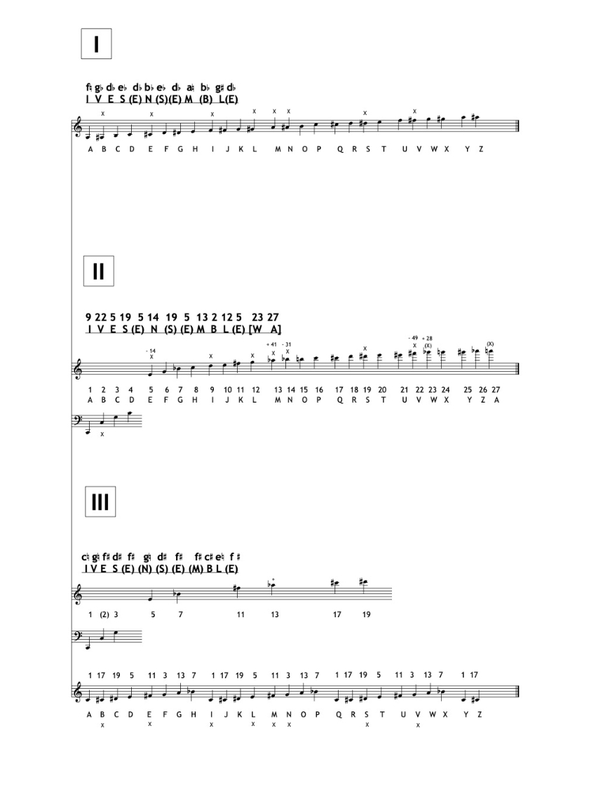 These letters are paired to three pitch, or number systems (chromatic, harmonic and as prime numbers of the harmonic series), which supply all of the harmonic material for each of the 'movements'. The letters are either read straightforward with retrograde (I), straightforward with transpositions (II) or straightforward with retrograde plus transpositions (III).