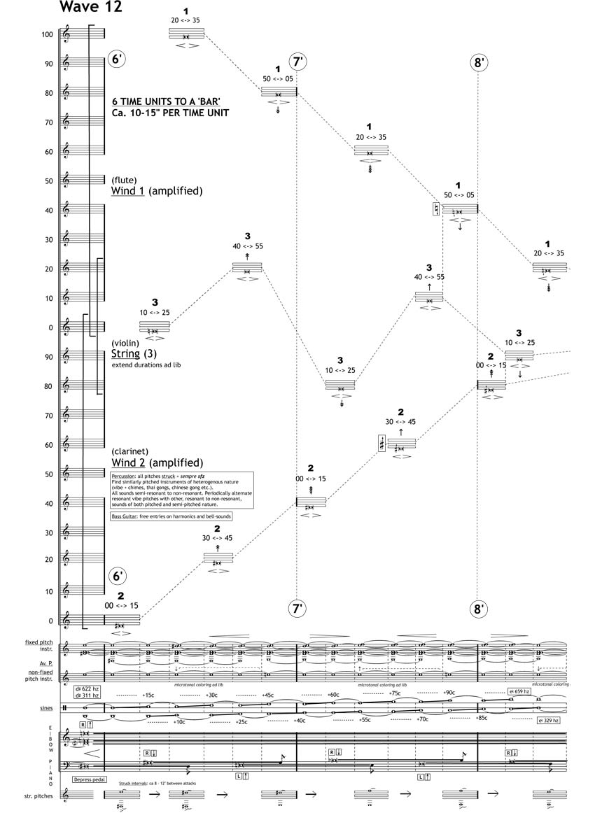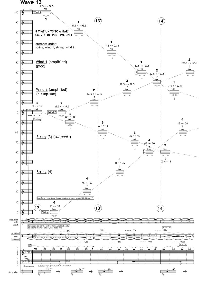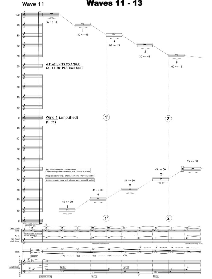 Written in 2008, Waves 11-13 is the first piece I wrote to include a composed, obbligato part for sine waves as well as being the first to be ascribe uniform time-lengths to each separate section. Scored for ‘Treble instruments’, Ebow Piano, percussion and bass-guitar, the piece limits itself to a narrow range of operation and an accordingly ‘clean’ interaction between the instruments. Each section explores one interval in one register, which is then microtonally scanned by the treble instruments. The form of each section is symmetrical, initially shrinking the size of each interval to half of its original size and then expanding outward again. As the piece progresses, the basic interval expands and the entries of the instruments increase accordingly.