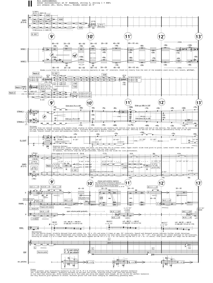 The Hammond Organ itself is used exclusively for the clear rhythmic patterns and often massive pulsations which are inherent to its construction and makes extensive use of weights with which the keys are held down – enabling a lot of play with specified drawbar combinations. The remainder of the ensemble either systematically trace the microtonal contours of the sine patch, in varying speeds and interval sizes (winds and strings), or complement these processes through tracking Hertz values (percussion, sections I and II) or through magnifying specific speeds in the sine-patch (piano keys and percussion). The Ebows (piano) and Electric Guitar mainly serve to conjure up harmony and alternate beating patterns.