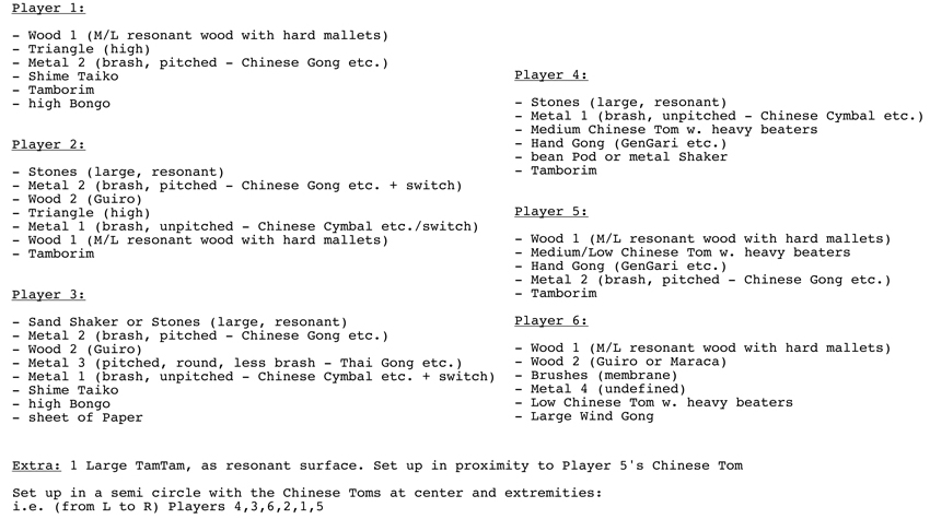 Written together with composer Maarten Altena, TWOMB for John Cage takes a special place among my works. Not merely due to the obvious difficulties of writing a piece of music together with another composer, but also because that person happened to be a close friend. In writing TWOMB (pronounced as a combination of the words ‘Two’ and ‘Tomb’) we set out to write a work in which ‘authorship’ could be as undetectable as possible. To this purpose we devised several formal rules, loosely based on the square root form of John Cage and all the possible combinations of five lines/players and then proceeded by allocating various speeds to each other. In all, the work consists of five pieces of material, which were divided equally: 2 and a half for each, formal inner subdivisions for one composer, ongoing continuous lines for the other. The entire work is technically linked up through the mutual use of palindromic number structures.