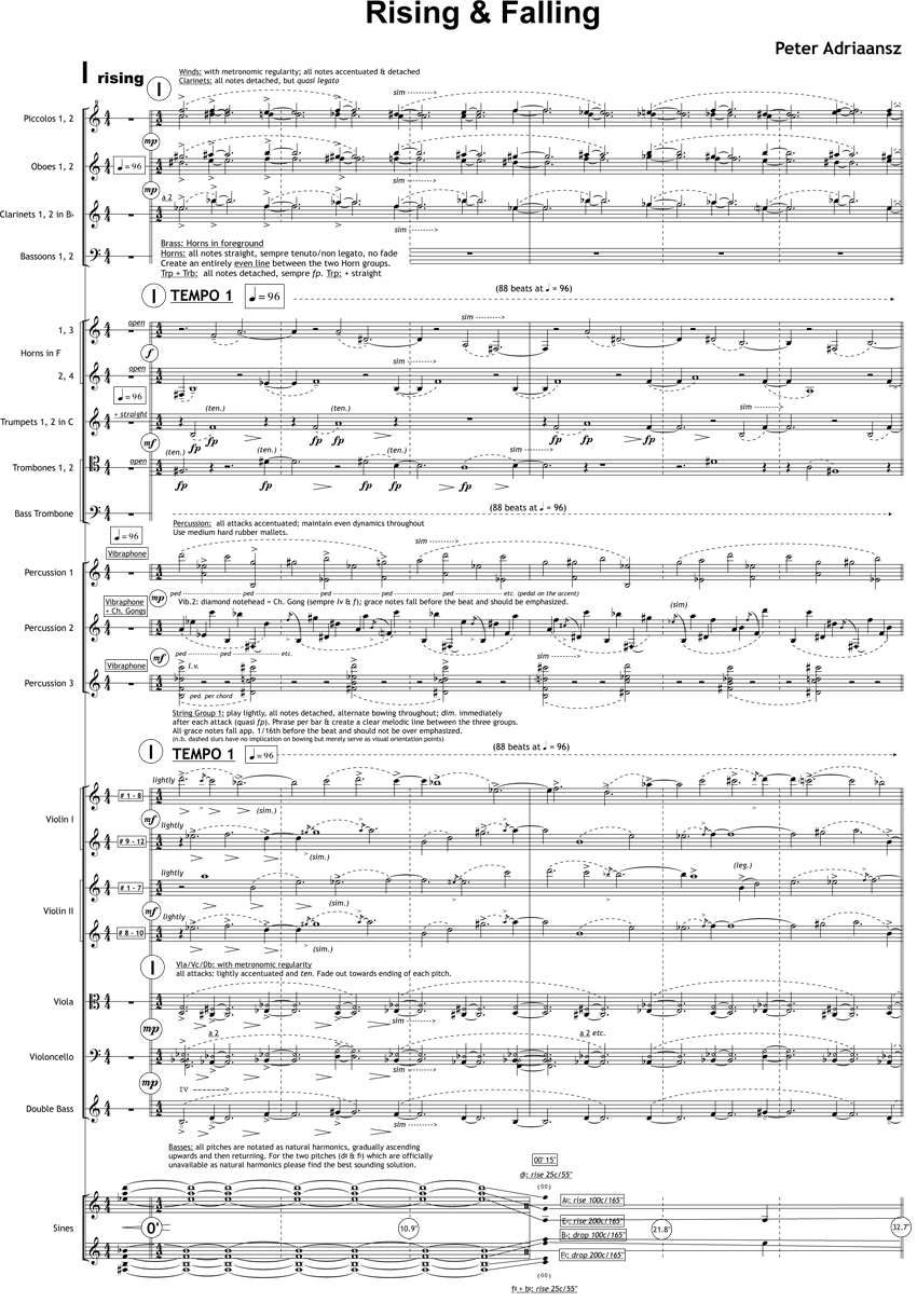 Rising is based on some of the melodic looping techniques developed in pieces like Phrase and the Scala series, but executed in this case on a sonically more grand scale. The melody slows down imperceptibly to the midpoint and then retrogrades while a hidden melody, embedded at the center of the harmony simultaneously ascends and then descends again. Falling is a development of the technique used in the second part of Shadings, with harmonic chords taking their cue from the sinewaves and either immediately sliding downwards (strings) or upwards (winds), thereby creating an interplay between seufzer-like gestures and aspirational gestures; tugging away at the center - but generally with an overall sagging feeling. Standing is something of a compromise between the two preceding parts. The pitch centers are clear again and the movement revolves around two ominous somewhat fin-de-siecle oscillating chords, divided over strings, winds and brass, which are however proportionally displaced per group. Like Rising and Falling, Standing also pursues an internal paradox whereby ‘chord’ and ‘echo’ (the so-called ‘aftertone’ in oriental practice) become obscured: the movement retrogrades and what was an ‘echo’ starts becoming a ‘pre echo’, until the process has gradually restored itself again by the end of the piece.
