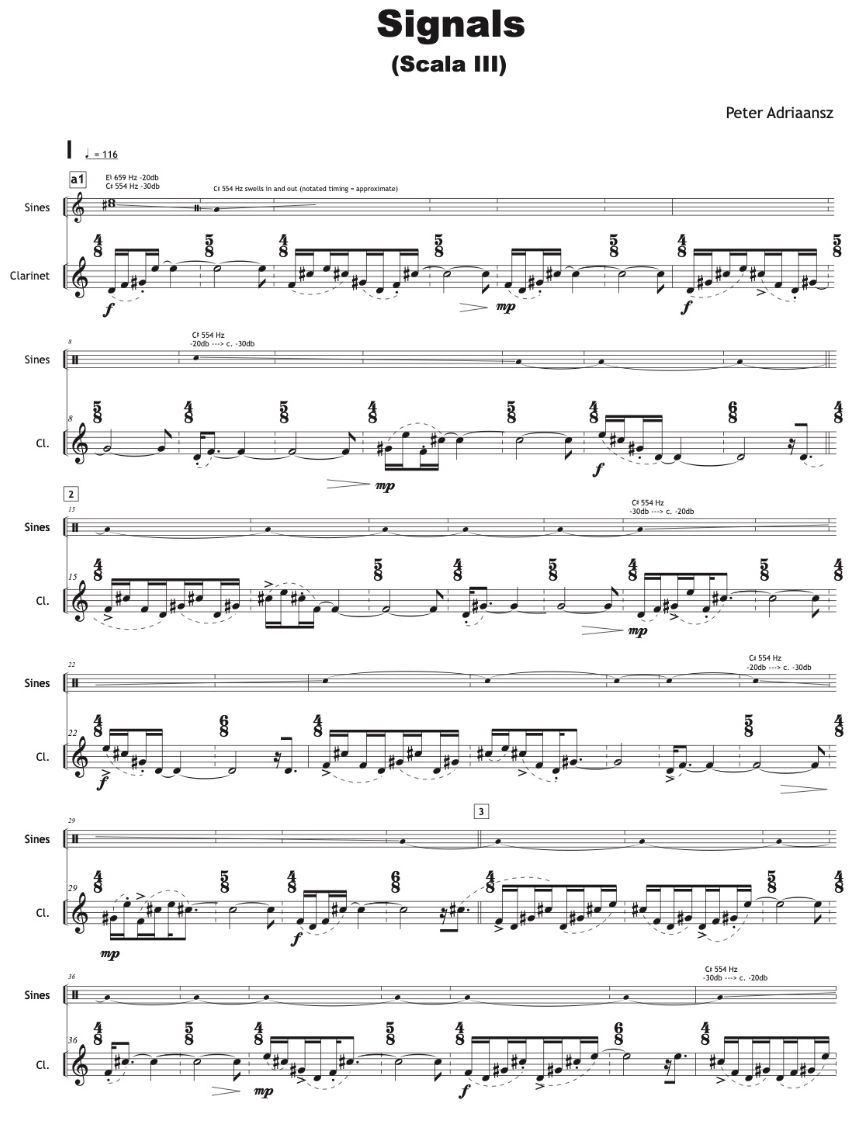Signals is a ca. 30’ piece for solo clarinet, sine waves and pre-recorded tracks written for clarinetist and photographer Michel Marang. Though started in 2014 Signals went through a very long gestation period of about 6 years before it was finally completed on paper during the initial lockdown period of Corona. The work is the third in a series of pieces which deal with rhythmicized melodic loops as its main source of organization. Where the earlier pieces in the series (Scala I & II) chiefly dealt with homophonic settings of a single line within the context of an ensemble, Signals, as a ‘solo’ piece, deals with independent, overlapping counterpoint between multiple lines; chiefly in the second part of the piece which aims at a sort of omnipresent ‘Jungle’ of interlocking lines reminiscent of Henri Rousseau’s more opulent Jungle paintings.