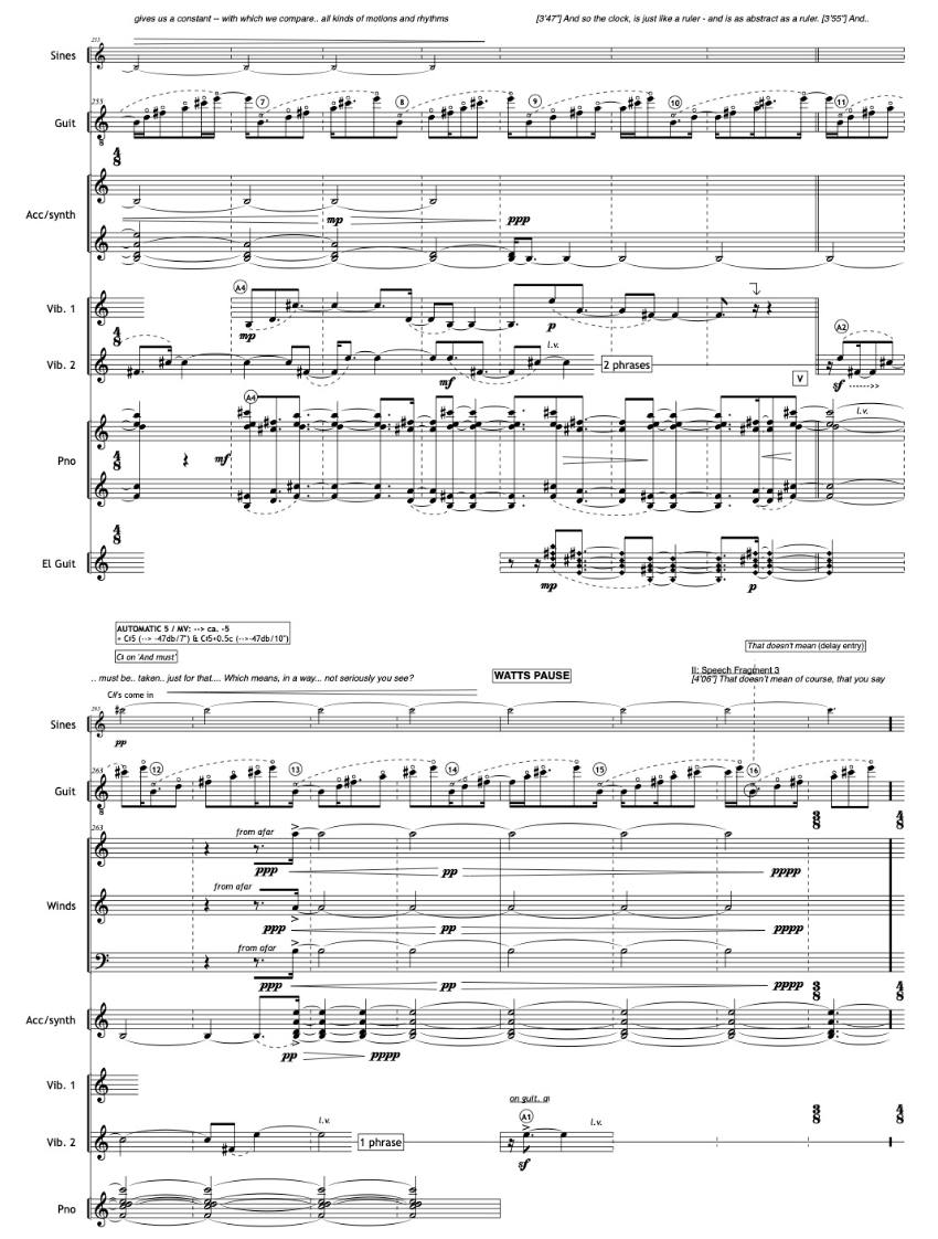 The content of Watts revolves around two central ideas: that of the 'continuum' and that of 'cyclicity'. 'Cyclicity' is pretty much covered in the circling sound design, the setup of the players, the eternal ups-and-downs of the ostinato and the long- developing, ever-renewing cells where the first thing is always the last. The idea of the continuum, hidden as it is meant to be, however reveals itself only as the speaker introduces it.