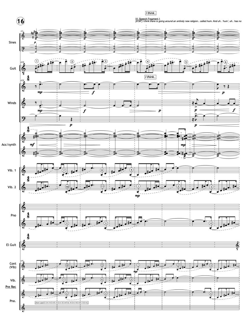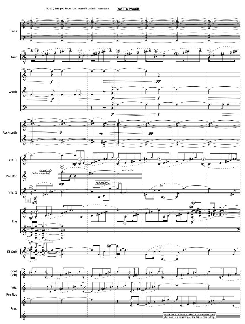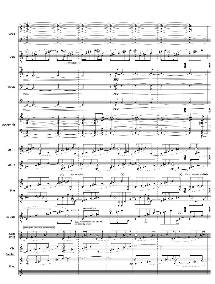 Special Features: Performance requires sound engineer, amplification for all musicians, click tracks throughout, 6 speaker surround sound setup, live electronics, Ableton sound patch, 6 different guitars and 2 synthesizers