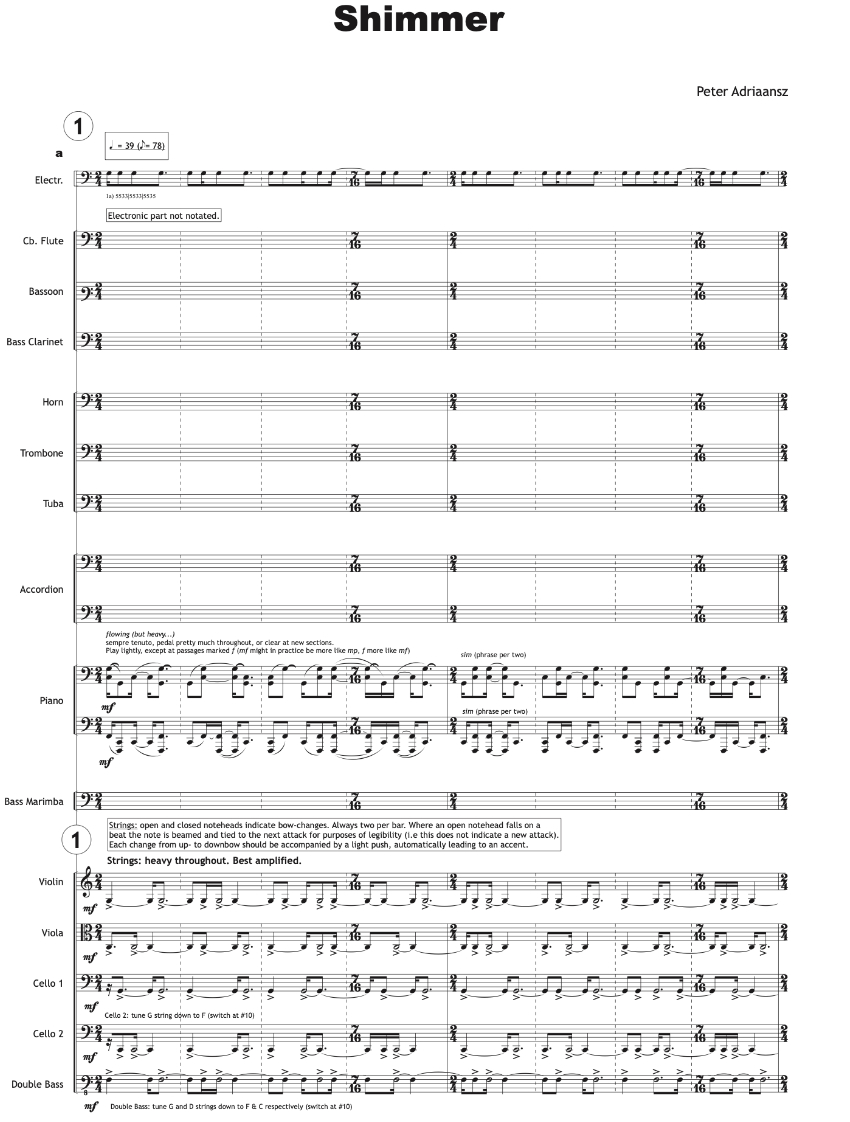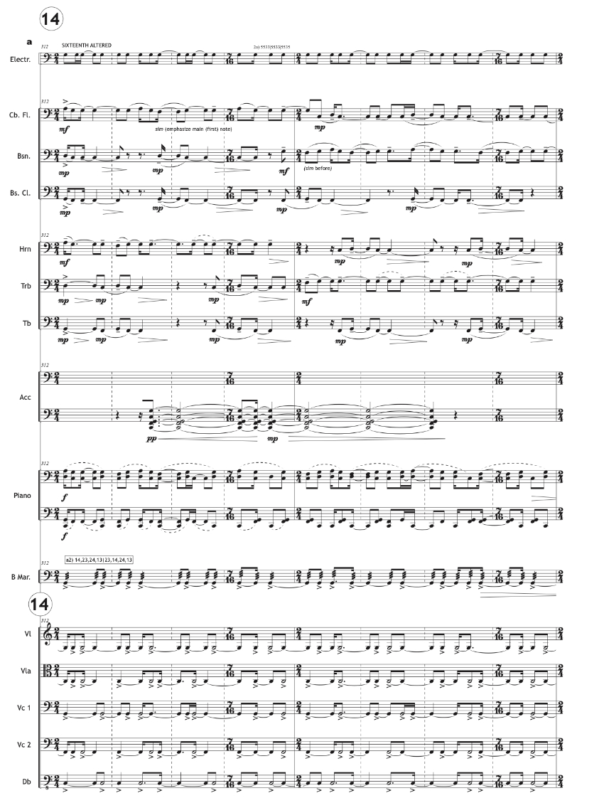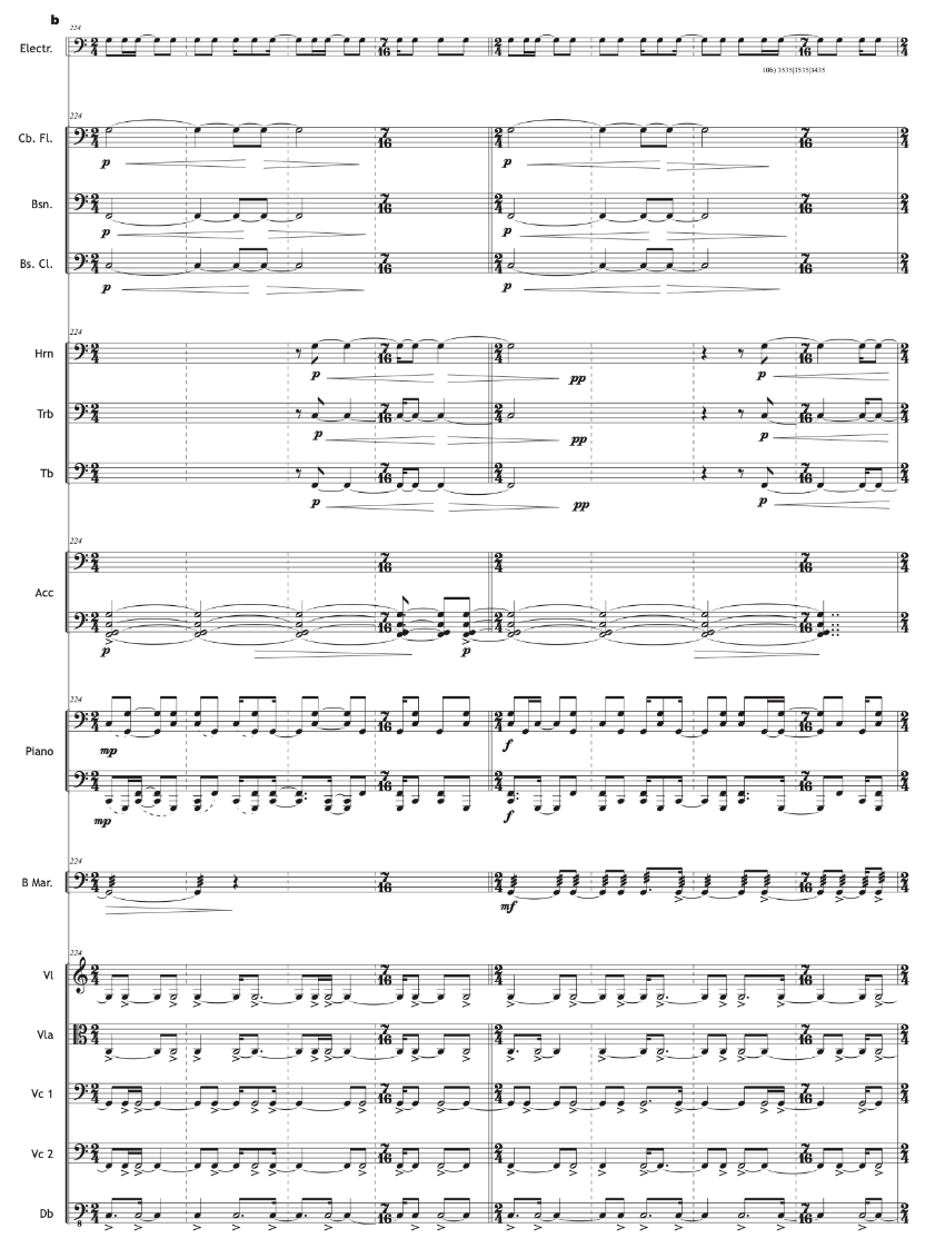 Tuba, Accordion, Piano, Bass Marimba, Violin, Viola, Cello 1, Cello 2 (or bowed harp), Double Bass