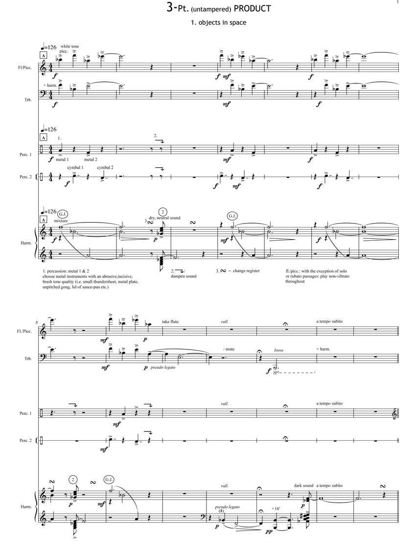 3-pt. (untampered) Product was written in 1998 at the request of the Dutch Harmonium player Dirk Luijmes. Unwilling to put a lot of effort however into a solo work, I extended the timbre and range of the instrument by adding piccolo, trombone and two percussionists.
