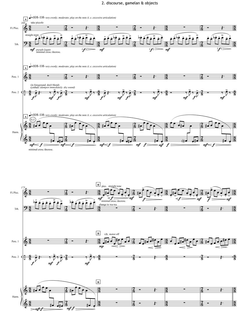 The work consists of three movements, titled 1) Objects in Space, 2) Discourse, Gamelan & Objects and 3) Drones, more Parallel Fourths & an Object - which all segue into each other and are linked by common material. The first part is exactly as the title describes: a sequence of small musical ‘objects’, which are ‘placed in time’ according to a square root form consisting of unvarying 13 and 14 bar periods. The second part combines a consistently varying 7-note figure with an expanding Gamelan-like refrain; interspersed again with small Objects. The third part consists of a somewhat exalted Chorale, which gradually intensifies as the piece comes to a close. The procedure is interrupted once by a single Object, which then returns again at the end.