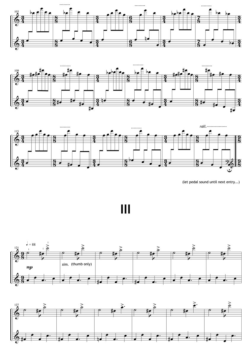 Pastorales I – VI were written on a private whim, for a private occasion, and have no special musical value. Based entirely on the first two harmonies of Robert Schumann’s Kinderscene, the piece proceeds as a set of variations, becoming longer and infinitely more difficult as the piece progresses. The writing is basically two-part throughout and seeks to obtain a clarity of texture such as one can encounter in Mozart’s piano writing for example. Due to its style the piece is a bit of an oddity among my work and for that reason not really open for performance.