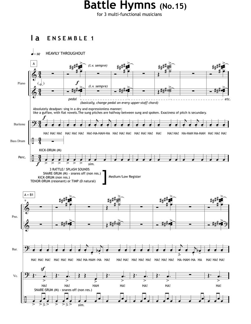 Battle Hymns consists of three movements, each exploring different ensemble-settings, metric relationships and sound worlds. The first of the three movements is split into two parts (‘ensemble 1’, for all three musicians, and ‘piano, snares and super-ball’, for piano and percussion). The second movement consists of two ‘solo pieces’, one for the percussionist (‘drums & snare’) and the other for the singer, singing over and into a large temple-bowl and accompanied by piano pizzicatos (‘singer, temple-bowls and piano-strings’). The final of the three movements (‘ensemble 2 - revolutionary song’) stars all three players again, each one now fully occupied.