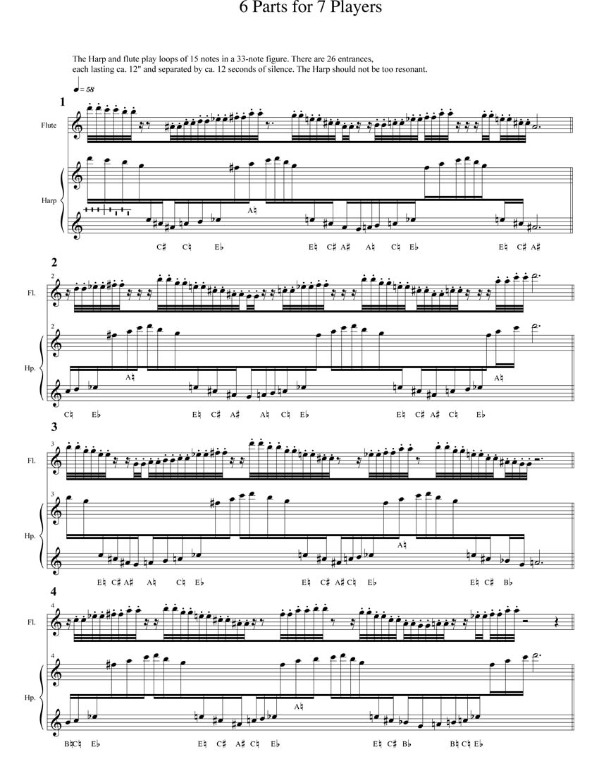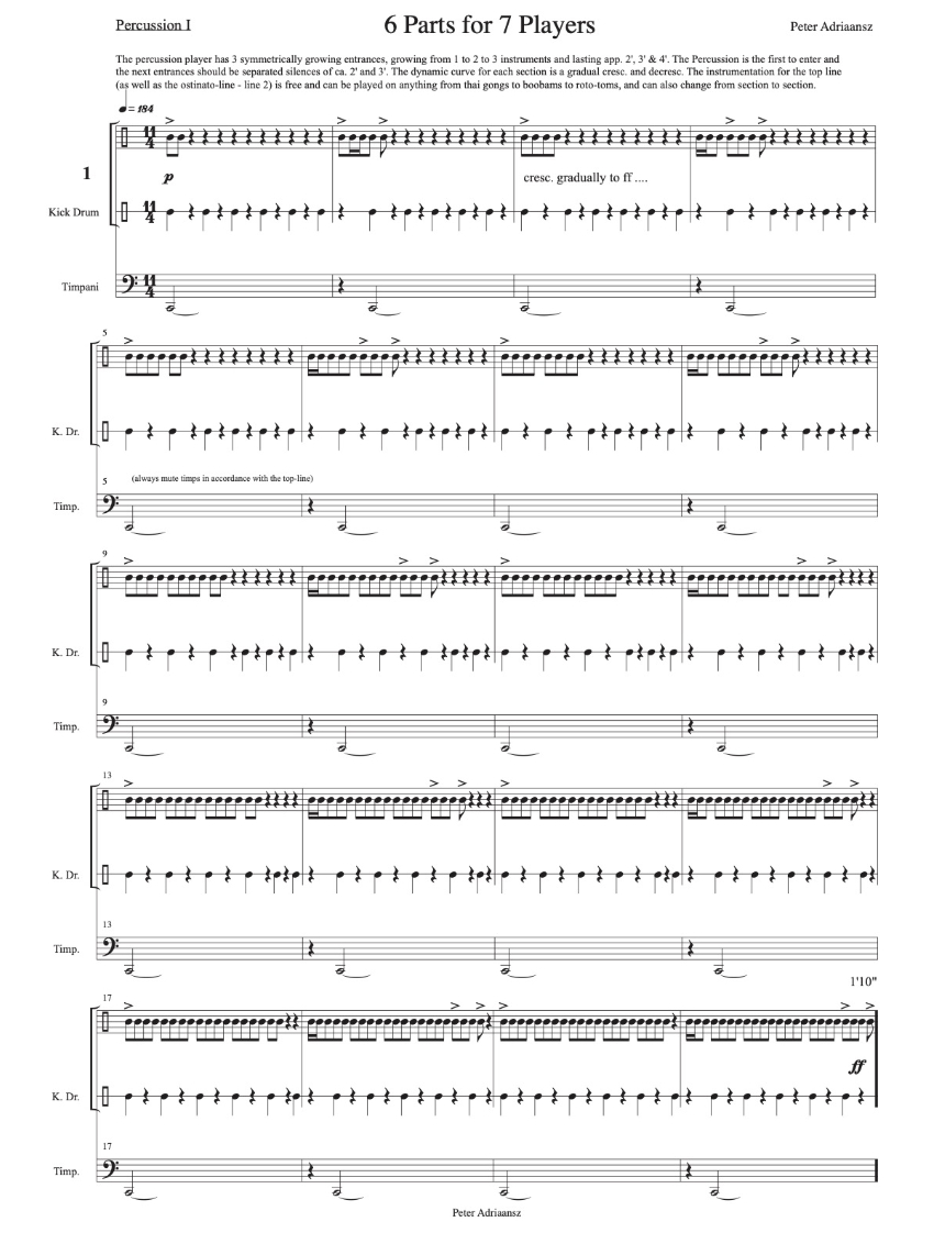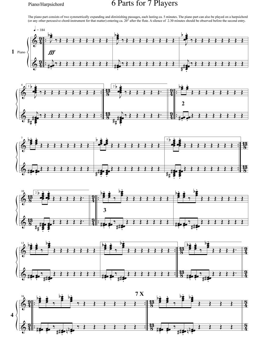 Consisting only of separate parts, 6 Parts for 7 Players (2003) is the first piece I wrote without a score. It was written for the Ives Ensemble with the specific purpose of being unconducted and follows some of Ives' ideas about simultaneous, non-synchronized events. The piece consists of 6 or 7 linear parts for 1 or 2 musicians per part. Several of these parts also have a free instrumentation, such as Percussion 1, Percussion 2 and the non-obligatory 'harmony part'. Each part has a differing number of entries and follows its' own, immediately discernible logic. The musicians enter and exit in a pre-ordained, symmetrical order (the first one in being the last one out, parallel to the symmetrical chord and patterning of the harpsichord part) and the work is glued together through a kind of ‘ringmaster’ - in the person of the percussionist – who plays an extremely demanding and steadily expanding figure at beginning, middle and end of the piece.