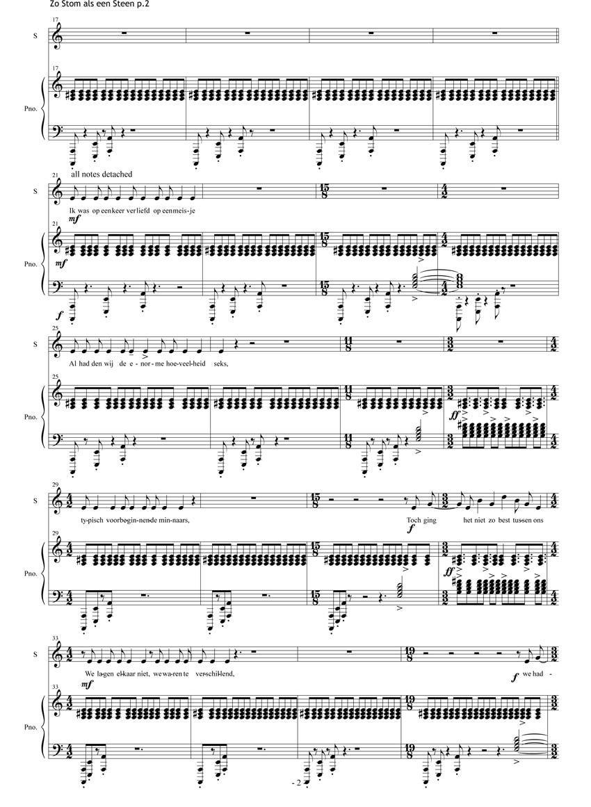 Zo stom als een steen (Mute as a Rock) was written at the request of Samuel Vriezen for a concert devoted to ‘Love Songs’. The piece is about as close as I’ve ever gotten to writing a pop song, be it that the sophisticated innuendos of the text and the difficulty of the piano part, with an obsessive ostinato (intended for the phenomenal Moritz Eggert), would probably surpass anything that any ordinary pop musician would be up to. As usual, when using a Dutch text - and especially in the case of Love Songs - I selected something by the particularly malicious Flemish writer Herman Brusselmans. The song thus tells the story of a physically perfect, but otherwise troubled relationship, in which one of the partners psychosomatically loses their voice - due to the lack of ‘a good conversation’.
