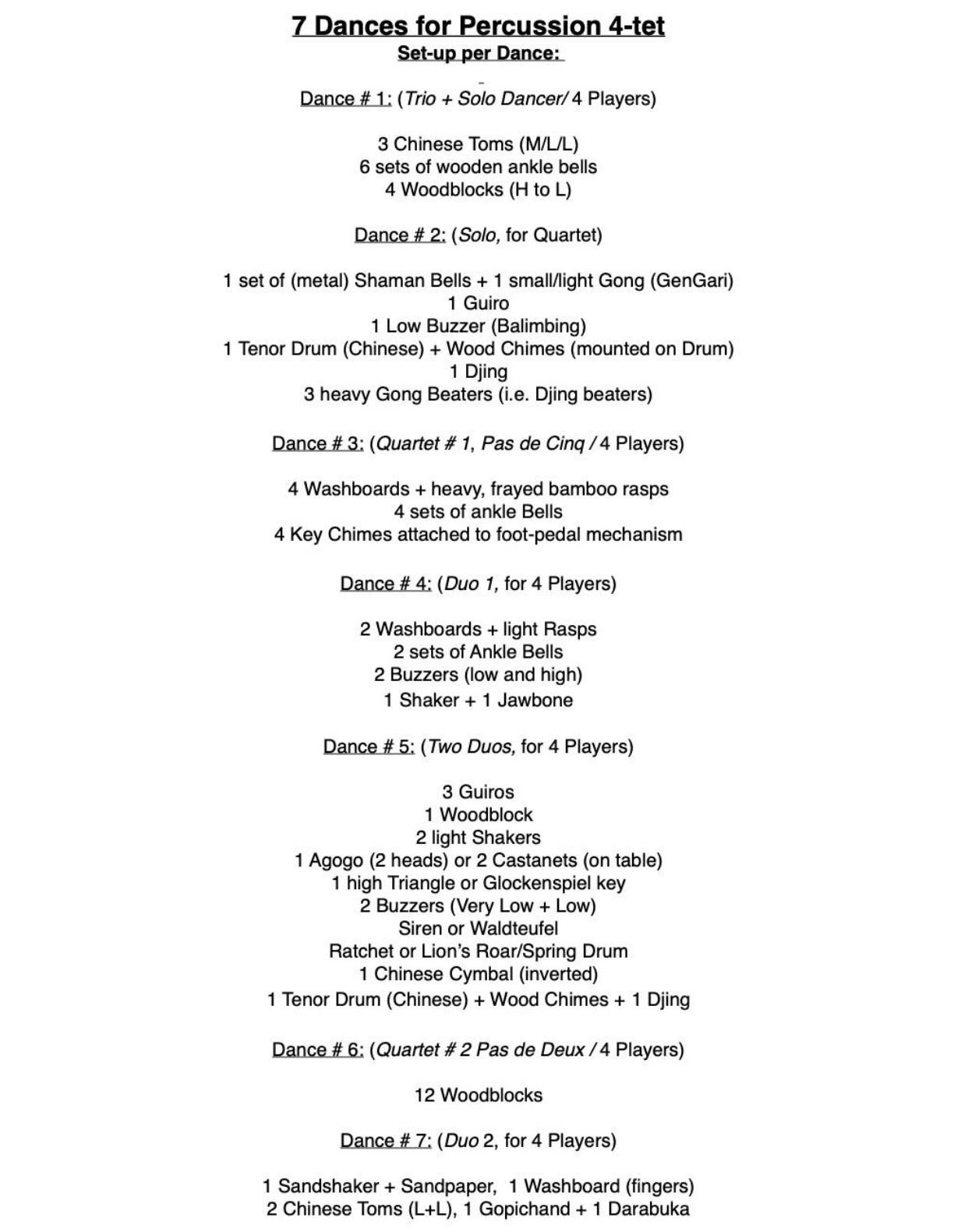 The seven movements are based on personal interpretations of what the phenomenon ‘dance’ reminds me of: pacing, the sound of feet on a floor, interactions between groups and soloists, movements in space, historical dance-terminologies and stylized forms. The instrumentation is mainly dominated by wood and skin sounds, which function as a sort of imaginary cross-pollination between the stately aspects of ancient Korean Court Music and a more secular – quasi South American – rasping ensemble… both linked to each other through a shared aesthetic of ‘composite sounds’ (i.e. one action resulting in multiple sounds), but otherwise probably quite surprised to find themselves grouped together like this.