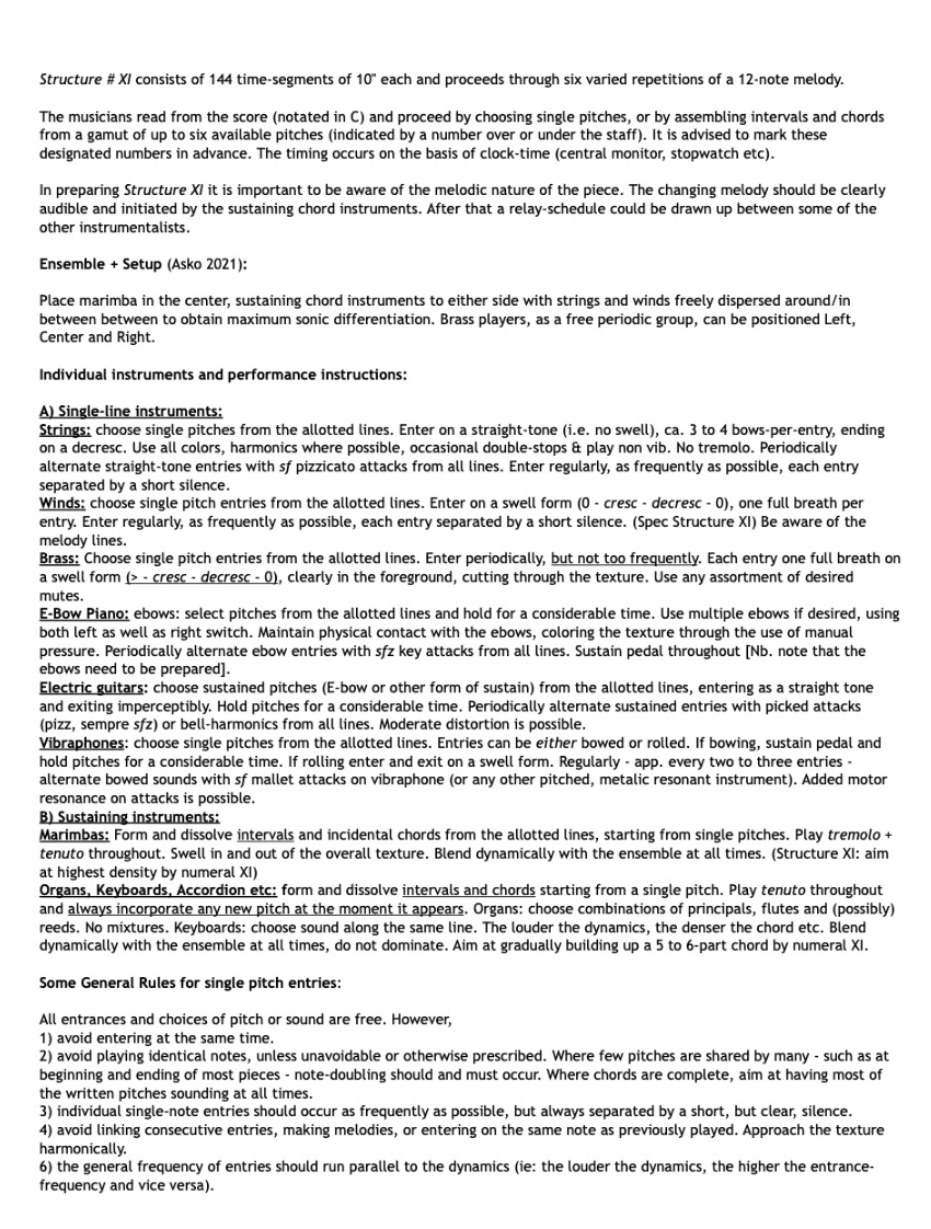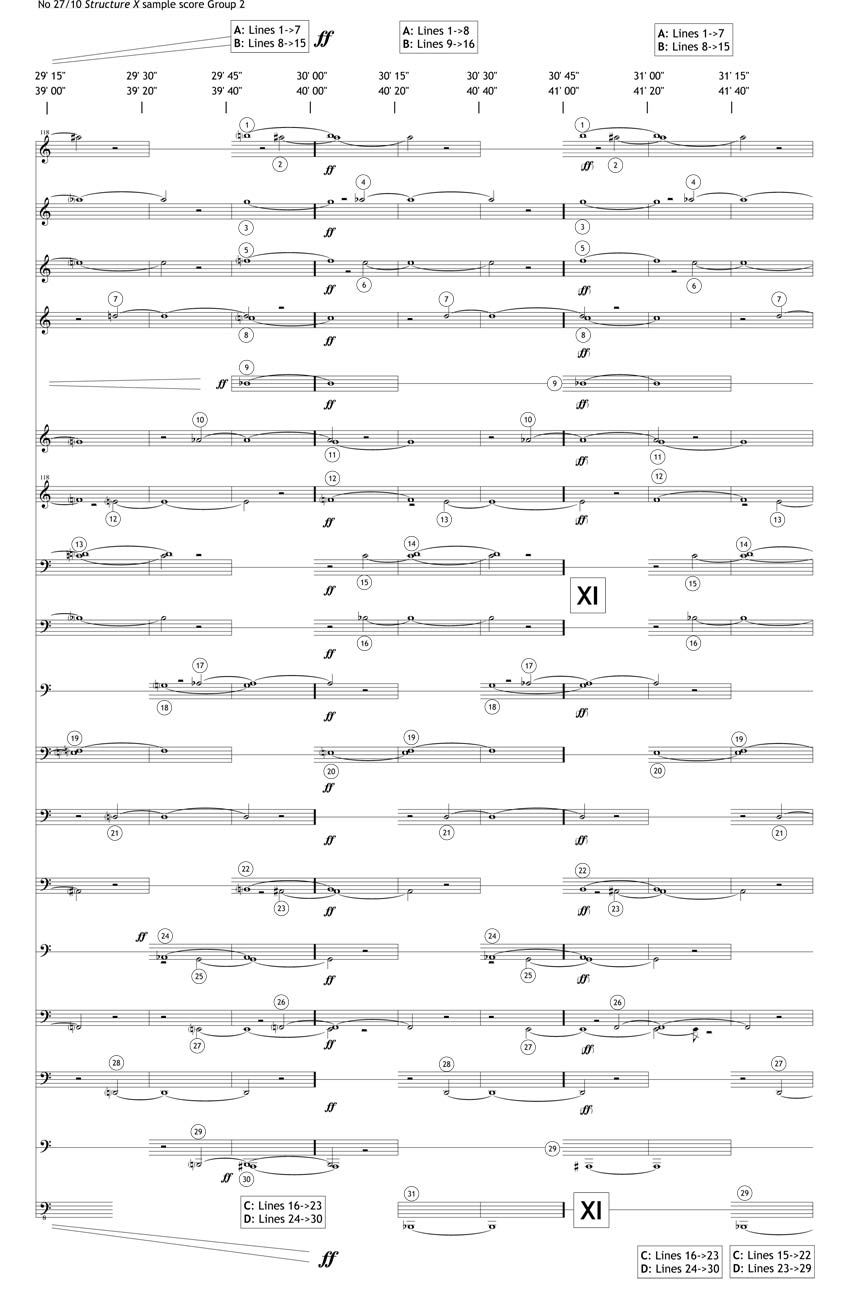 Structures X-XII are part of an app. six-hour-long series of works, written in 2005, which deal with ideas of infinity and variable color-change. The series is subdivided into five size- and topic-related sets, which can be performed individually or within a sequence. The works can be played by any set-up ranging from small chamber ensembles to large orchestras, with or without live-delay. The music is notated according to the so-called technique of ‘available pitches’: a technique in which a gamut of pitches is notated within time-segments and the musicians are left free to choose both pitch as well as entry. The performers all play from the score, following a set of General performance instructions and a specified mapping-scheme customized to each particular occasion (for examples of playing instructions and Mapping (line-division) see popup menu above).