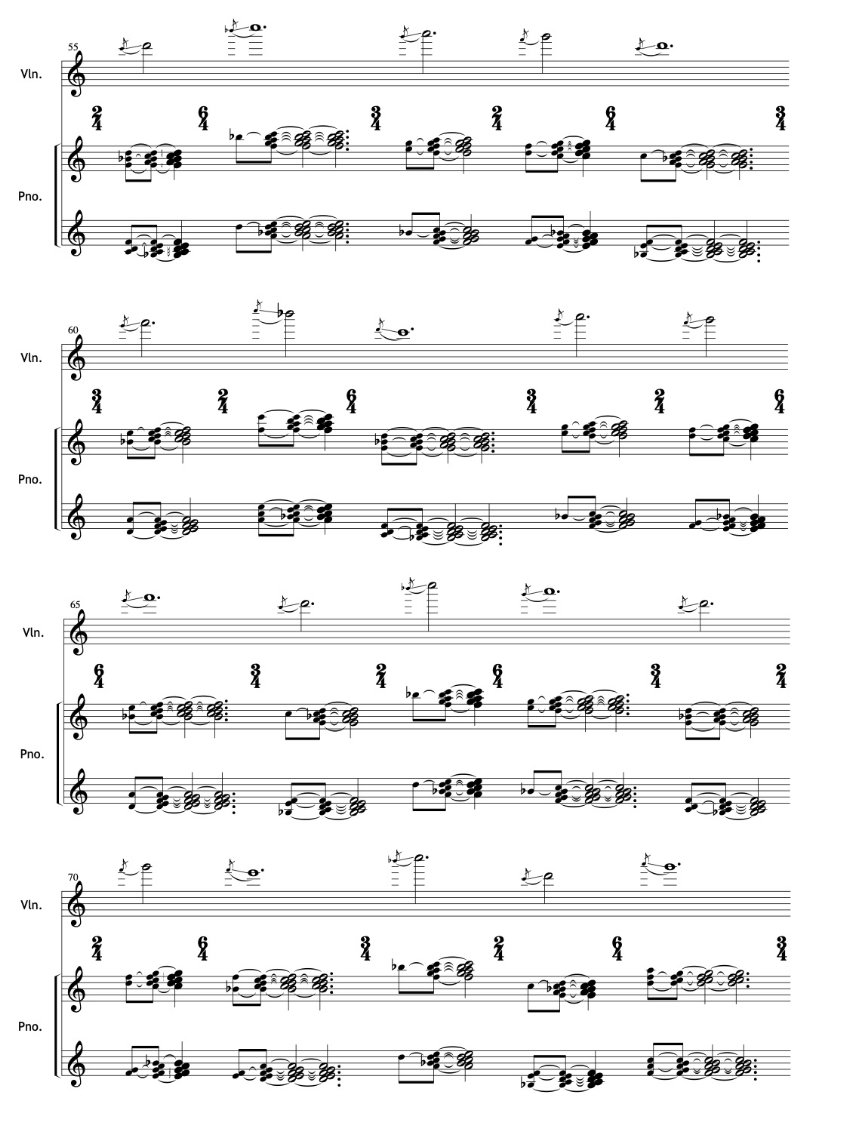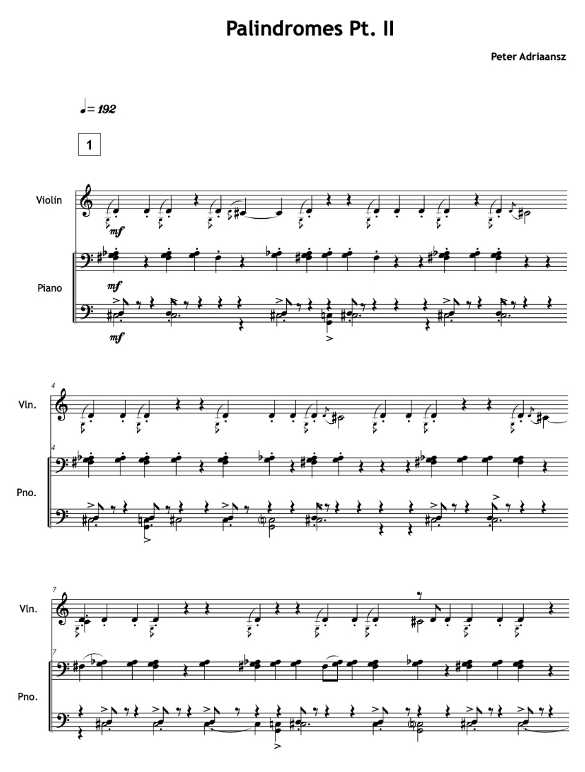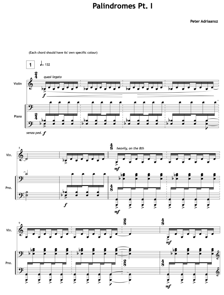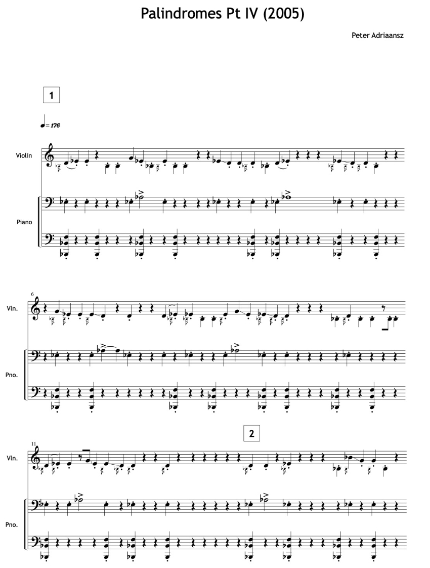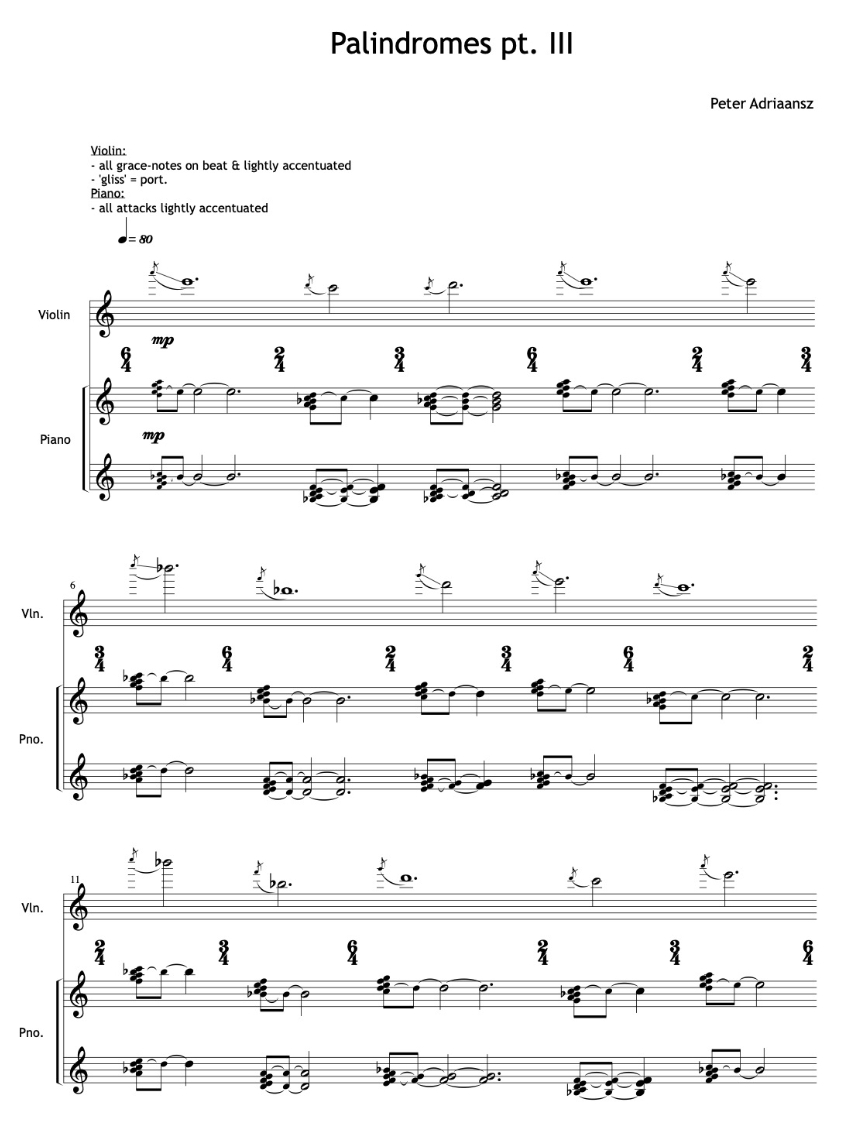 Though Palindrome 3 is a perfect palindrome it is also a somewhat curious one since it ostensibly seems to move forward continually, but with a surprising sonic change at the center. It might more properly be called a ‘quasi palindrome’ since it combines two different types of palindrome: one, linear/melodic (violin) and the other, sonic/motoric (piano). Where the violin reverses its line half way through, the piano reverses its action: from chord/interval-resonance (senza pedale) to interval/ chord (con pedale). Though the action is perfectly retrograded one sonic action thereby suddenly becomes two actions.