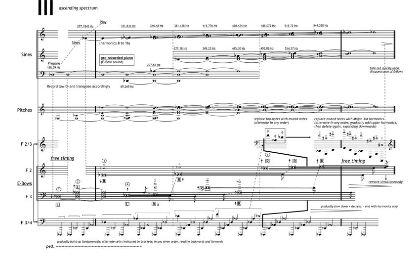 Four works for Ebow Piano & live electronics (sine-patches and samples, preferably performed live and interactively). Written in 2007 at the request of Sonsoles Alonso. The works all prescribe a simultaneous interaction between the keys of the piano and the placement of the Ebows with which the piano strings are excited - and in some cases demand a considerable degree of virtuosity from the pianist, having to co-ordinate, choose and listen all at the same time. Each piece focuses on a different form: a descending line in the first (against sines dropping 2, 3 and 4 octaves respectively), enharmonic overtone relationships in the second, an ascending spectrum in the third (against a combination of sampled piano strings and sine tones) and the building up of a harmonic chord in the fourth (with an interactive part for the sines). Each piece is notated in a form of free timing and is thus, within acceptable limits, variable in its length.