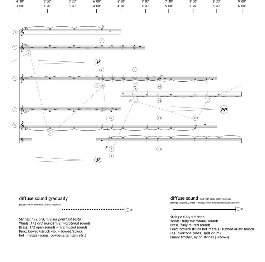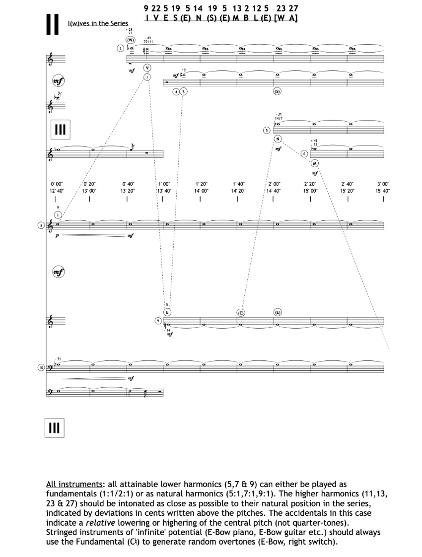 These letters are paired to three pitch, or number systems (chromatic, harmonic and as prime numbers of the harmonic series), which supply all of the harmonic material for each of the 'movements'. The letters are either read straightforward with retrograde (I), straightforward with transpositions (II) or straightforward with retrograde plus transpositions (III).