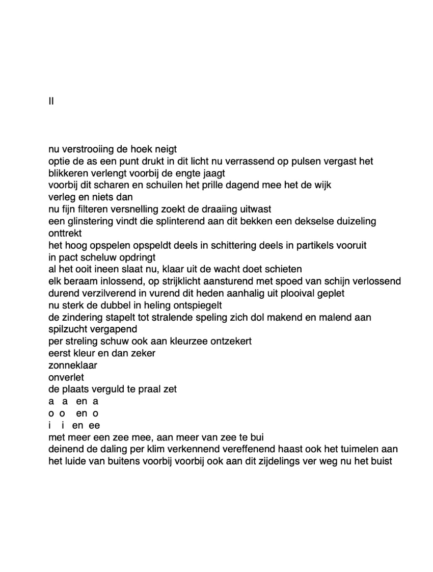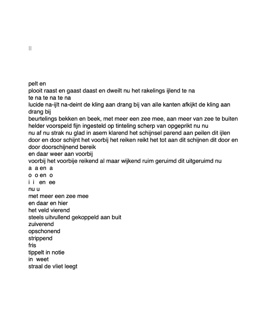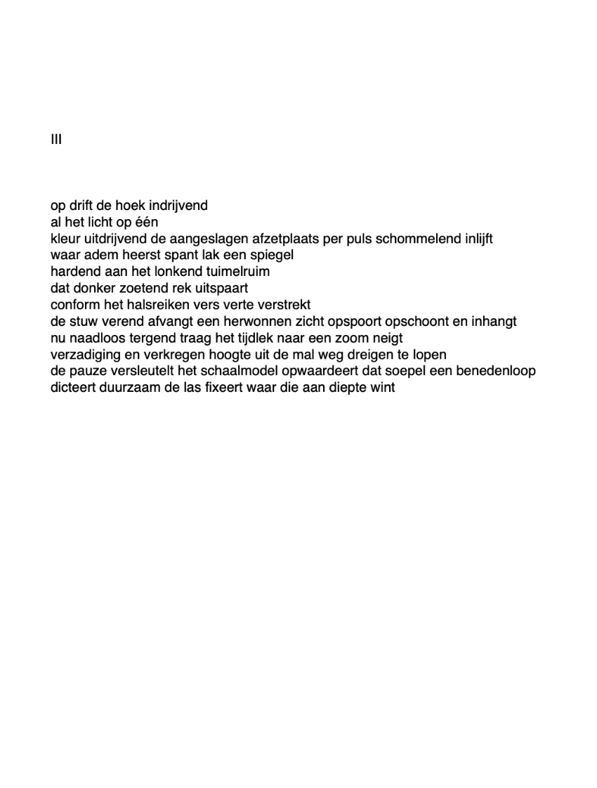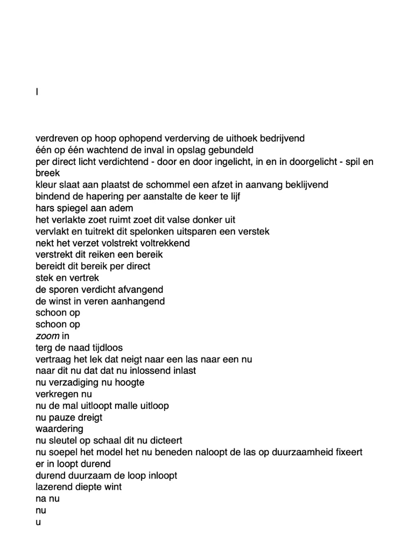 When starting off the collaboration with poet Astrid Lampe, and not wanting to resort to a simple ‘setting’ of a prior text, we quickly decided to strive for a one-on-one relationship between text and music so that whatever occurred in the music would at all times be suggested by the content of the text and vice-versa. Text and music were thus conceived independently and were discussed exclusively on the basis of subject matter, textual density and poetic form. Eventually several topics emerged pertaining to density, direction, luminosity and so on. Once completed, the text was chopped up in time segments which were then divided over the score and performed by the Poet in a similar way as the musicians would be performing their parts. In this way, ‘the poet’ naturally became ‘a musician’.