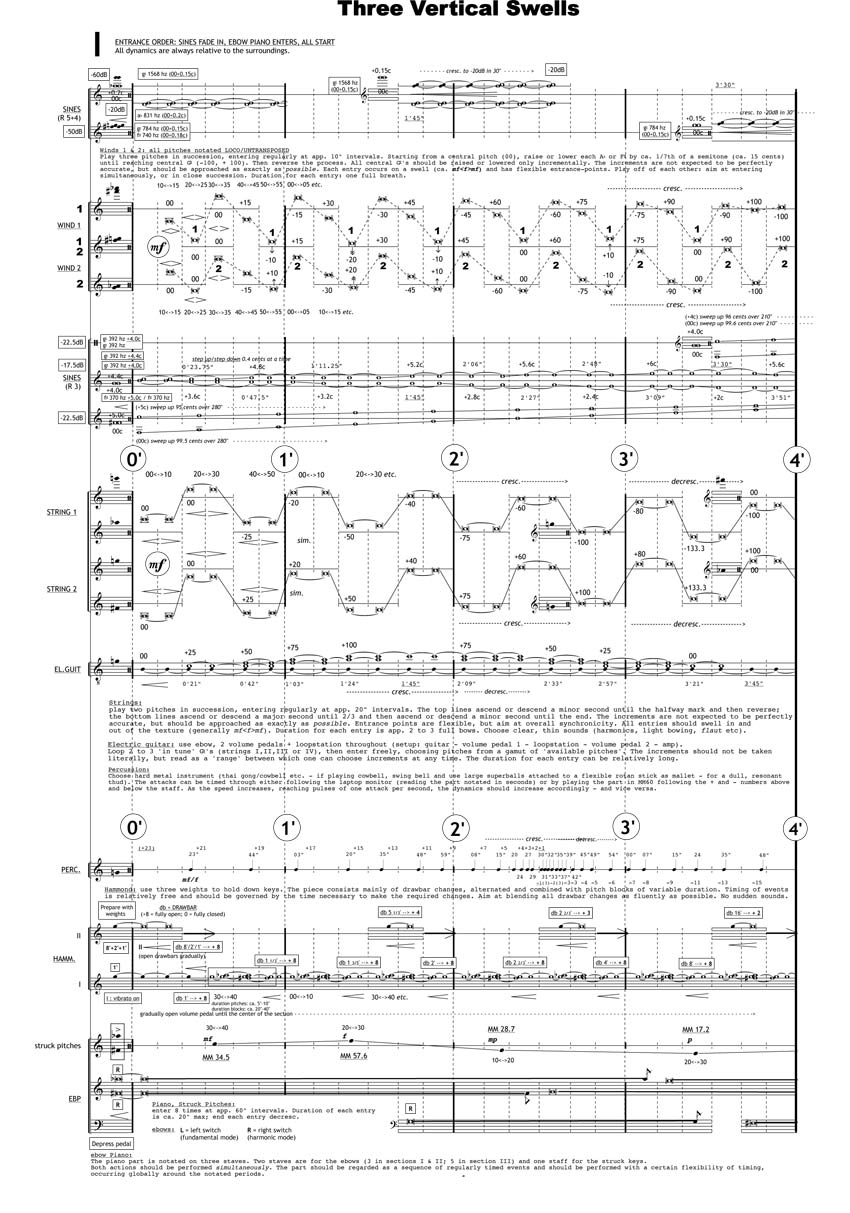 Three Vertical Swells consists of three nine-minute movements for Hammond Organ, amplified ensemble and sinewaves. The piece indirectly takes its title from an analysis I made of the Leslie loudspeakers prior to writing the piece. Two significant elements thereof were translated on to the music as a whole: 1) the speed of the revolving Leslie horns and 2) a curious, probably unintended, glissando-like fuzz which seemed to emanate from the loudspeakers. Both elements served as a direct source for the sine-patch, which due to the extremely slow beating-patterns (up to 1/1000th of a cent), seemed to result in a sense of acoustic motion which was often more up down (vertical) than left right (horizontal).