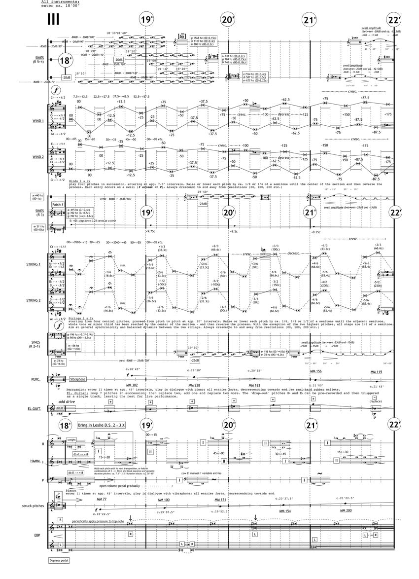 The Hammond Organ itself is used exclusively for the clear rhythmic patterns and often massive pulsations which are inherent to its construction and makes extensive use of weights with which the keys are held down – enabling a lot of play with specified drawbar combinations. The remainder of the ensemble either systematically trace the microtonal contours of the sine patch, in varying speeds and interval sizes (winds and strings), or complement these processes through tracking Hertz values (percussion, sections I and II) or through magnifying specific speeds in the sine-patch (piano keys and percussion). The Ebows (piano) and Electric Guitar mainly serve to conjure up harmony and alternate beating patterns.
