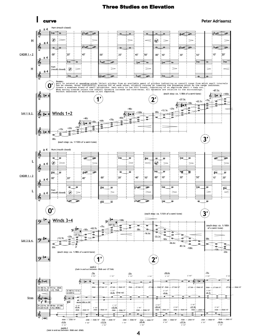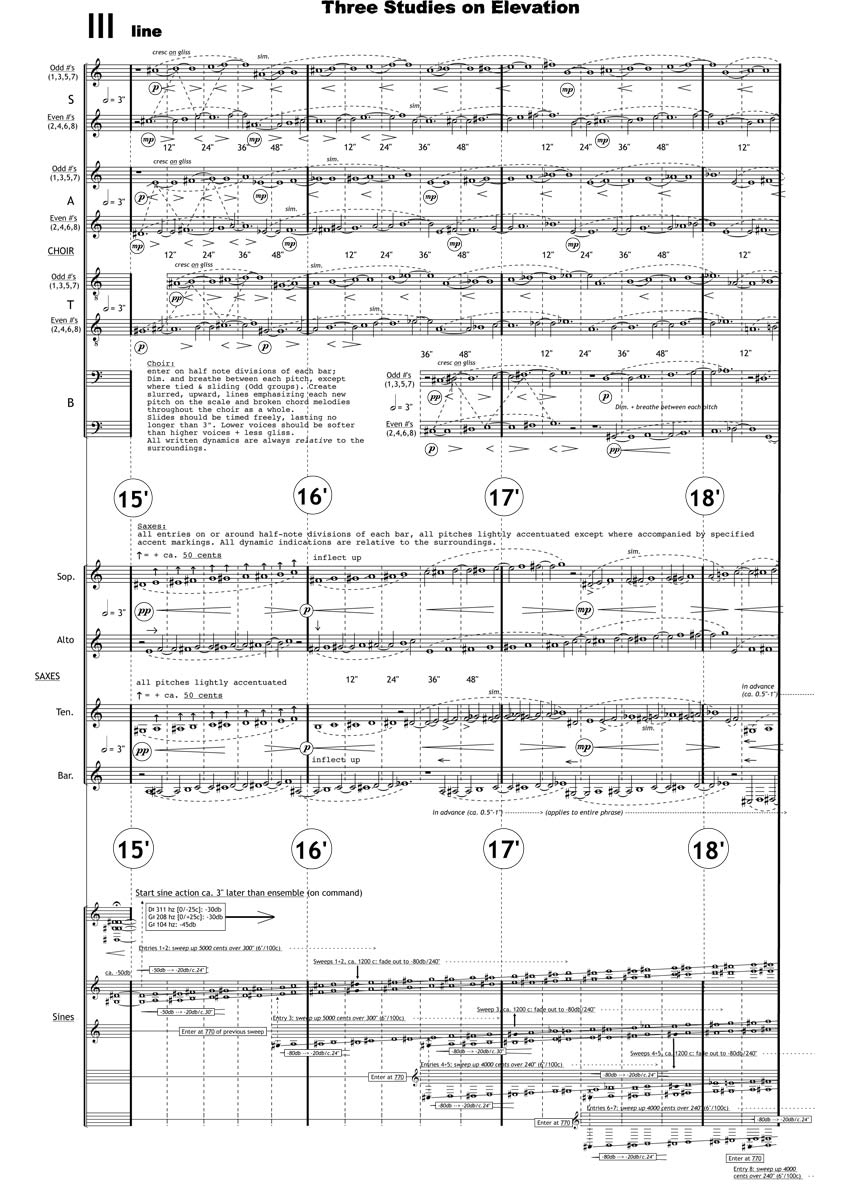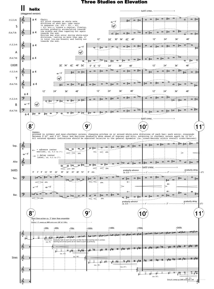 The work consists of three seven-minute movements, titled successively: curve (asymmetrically ascending and then descending in the saxes, while the choir intones all possible chords within a four-note gamut); helix (gradually rising over three octaves, originating and terminating at fixed points and forming harmonic chords towards the center; with, under the proper conditions a curious psycho-acoustic phenomenon towards the end); and line (ascending ‘infinitely’ in the sines, with the musicians continually ascending in terraced scales).
