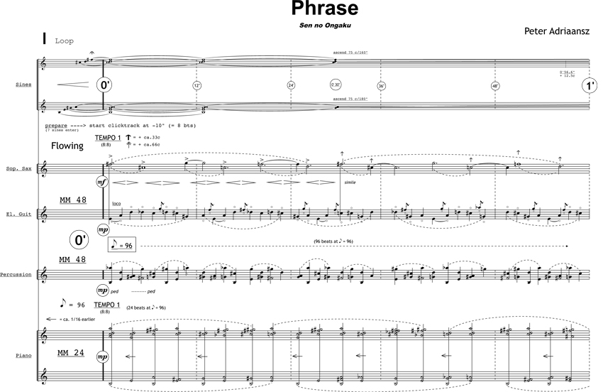 Phrase was written in April 2011 for the ensembles Flexible Music and Klang and was premiered during a three-day Festival devoted to my work. The work takes as its departure point the idea of single lines of differing phrase lengths, which are looped over the three attack instruments and are accompanied by a much slower line for the Saxophone. The piece is set against a slowly moving sine chord, ascending 3⁄4 of a minor second by the halfway mark and then descending again to its original position. The tessitura of Phrase is set in relatively high position, allowing each attack to stand out against the sine chord as little, distant stars, flashing briefly before fading again. The piece plays a slight game with tempo-perception as the three attack instruments gradually slow down to 1.5 times their original length – and then speed up again for the second half - while the saxophone seemingly speeds up and slows down in the score, but in fact maintains a consistent tempo throughout. Ideally, Phrase should be performed together with Fraction (No. 49).