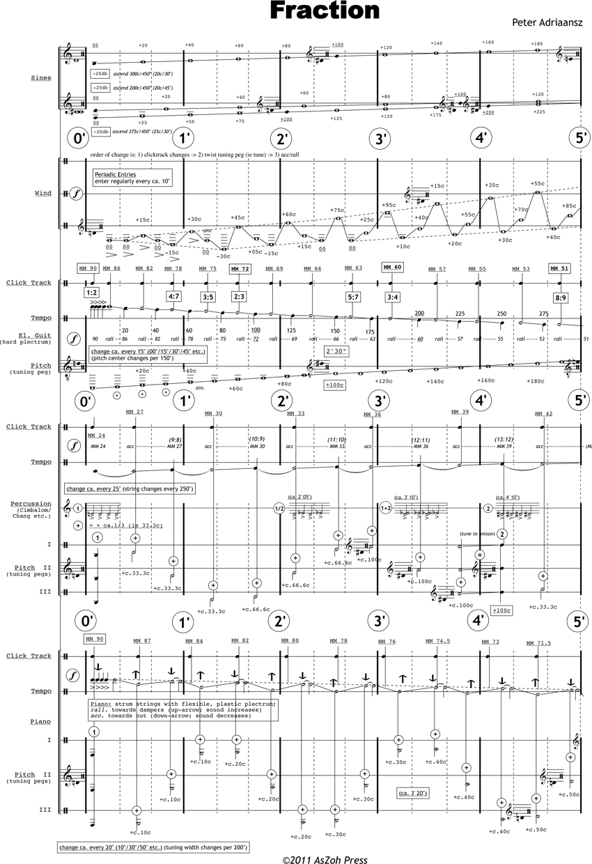 Fraction is written as a companion piece to Phrase (No. 48) and is scored for the same basic setup, consisting of a wind player, electric guitar, percussionist and piano. Like Phrase, all instruments are amplified and follow either click tracks or on-stage monitor stopwatch. With the exception of the Wind part, the piece is entirely strummed, picked or hammered and loosely uses Henry Cowell's Harmonic Tempo Scales as an artificial means to create even tempo modulations on the basis of ratios. In this way each of the three attack instruments follow a different curve, with the electric guitar initially decelerating from MM 90 to MM 45 and then accelerating to MM 60, the piano decelerating from MM 90 to MM 60 and the percussion accelerating from MM 20 to MM 60. Linked to the tempo phasing, the strings of the three attack instruments - starting in unison - are continually re-tuned until a major 2nd apart at 3/4 of the piece, thus gradually moving apart in tempo as well as pitch before reuniting again at the end. Ideally, Fraction should be performed together with Phrase.