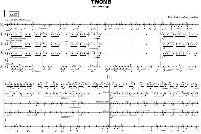 Written together with composer Maarten Altena, TWOMB for John Cage takes a special place among my works. Not merely due to the obvious difficulties of writing a piece of music together with another composer, but also because that person happened to be a close friend. In writing TWOMB (pronounced as a combination of the words ‘Two’ and ‘Tomb’) we set out to write a work in which ‘authorship’ could be as undetectable as possible. To this purpose we devised several formal rules, loosely based on the square root form of John Cage and all the possible combinations of five lines/players and then proceeded by allocating various speeds to each other. In all, the work consists of five pieces of material, which were divided equally: 2 and a half for each, formal inner subdivisions for one composer, ongoing continuous lines for the other. The entire work is technically linked up through the mutual use of palindromic number structures.