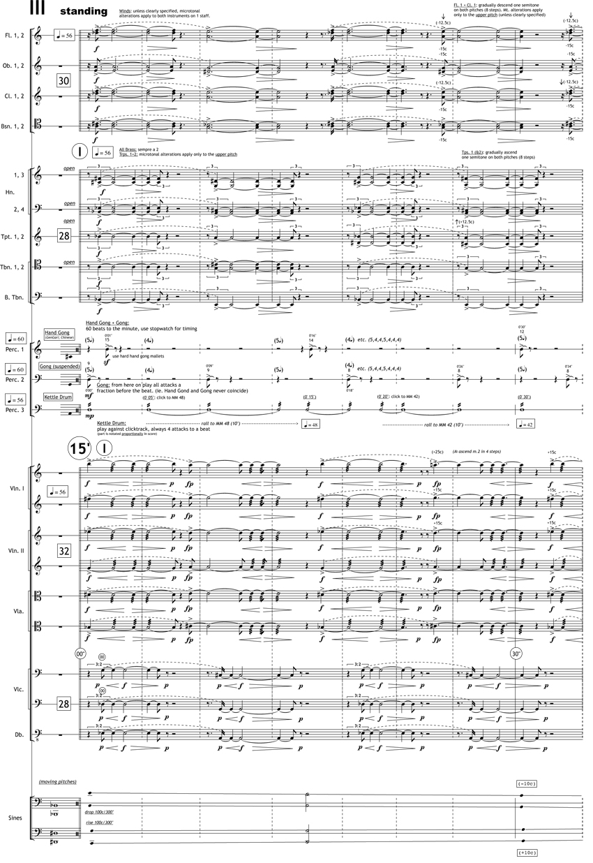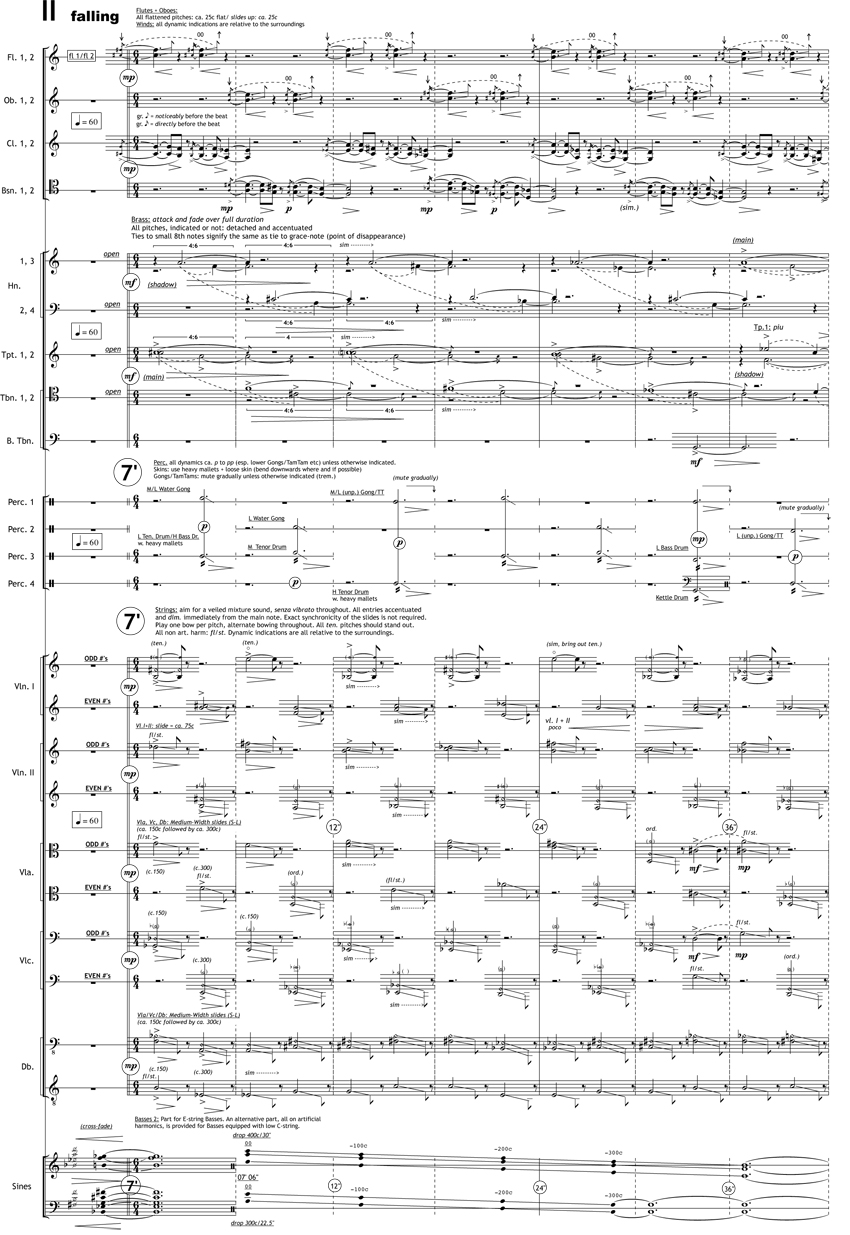 Rising is based on some of the melodic looping techniques developed in pieces like Phrase and the Scala series, but executed in this case on a sonically more grand scale. The melody slows down imperceptibly to the midpoint and then retrogrades while a hidden melody, embedded at the center of the harmony simultaneously ascends and then descends again. Falling is a development of the technique used in the second part of Shadings, with harmonic chords taking their cue from the sinewaves and either immediately sliding downwards (strings) or upwards (winds), thereby creating an interplay between seufzer-like gestures and aspirational gestures; tugging away at the center - but generally with an overall sagging feeling. Standing is something of a compromise between the two preceding parts. The pitch centers are clear again and the movement revolves around two ominous somewhat fin-de-siecle oscillating chords, divided over strings, winds and brass, which are however proportionally displaced per group. Like Rising and Falling, Standing also pursues an internal paradox whereby ‘chord’ and ‘echo’ (the so-called ‘aftertone’ in oriental practice) become obscured: the movement retrogrades and what was an ‘echo’ starts becoming a ‘pre echo’, until the process has gradually restored itself again by the end of the piece.
